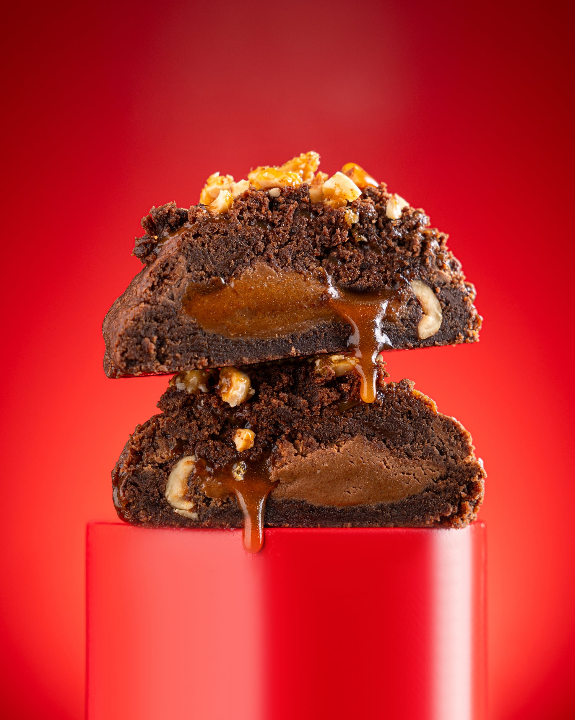 A fudgy double chocolate cookie filled with hazelnut brownie butter and our signature salted caramel, studded with candied hazelnuts inside and out. It’s chewy, crunchy, gooey, and bold - basically your favourite brownie, just in cookie form.
