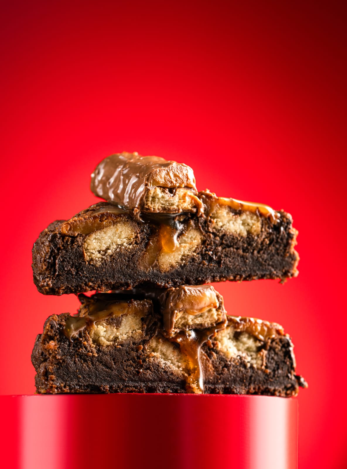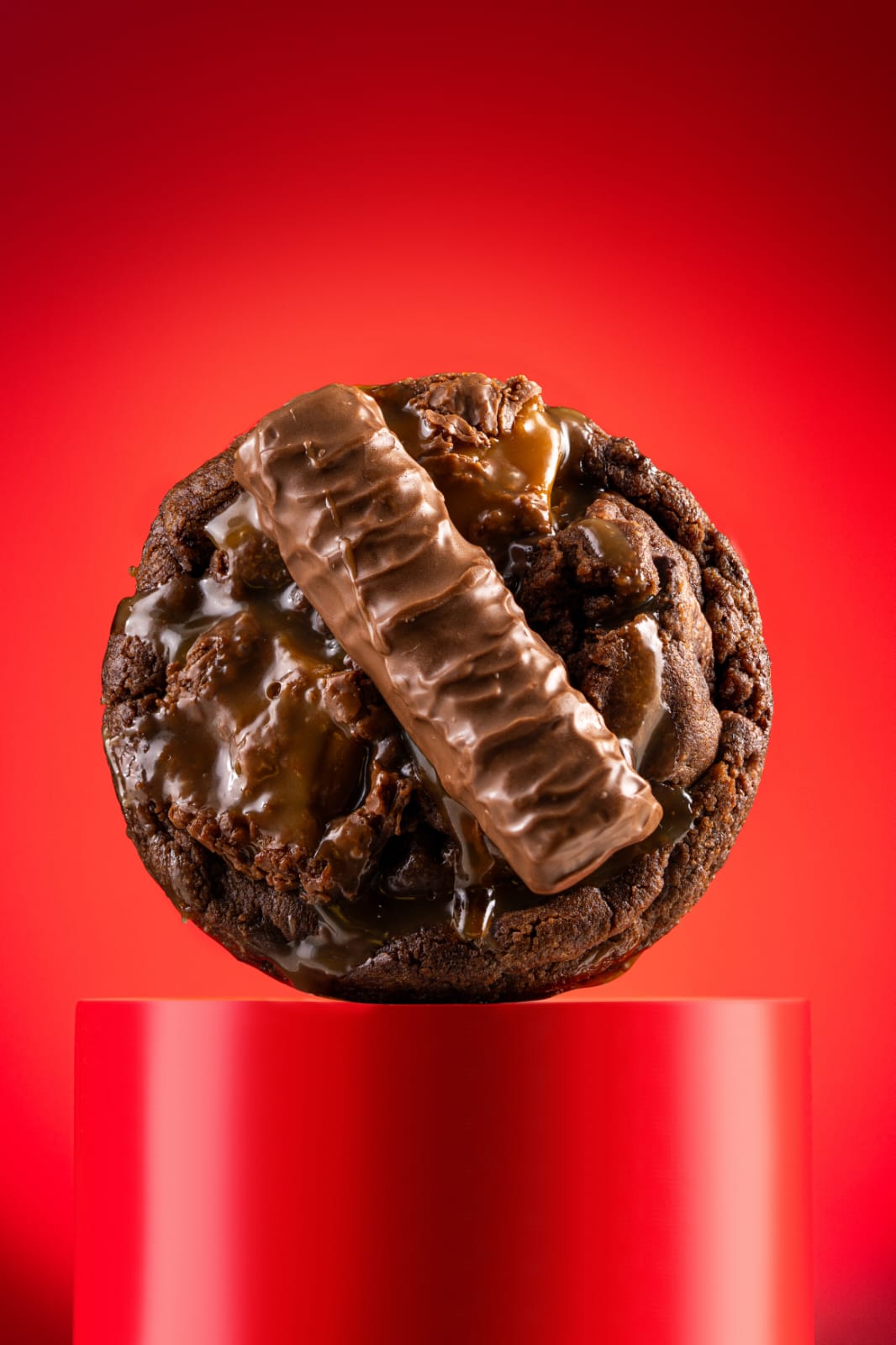 This cookie queen rolls in with a lush chocolate cookie dough base, stuffed with chunks of Twix bars inside and crowned with even more Twix on top. But the real plot twist? A slow, sultry pour of golden caramel that drips like she’s late to her own party.